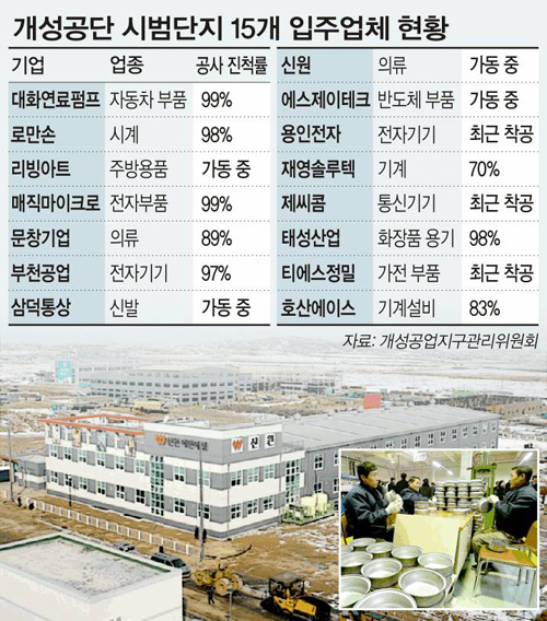 개성공단 시범단지에 입주할 15개 기업 중 마지막 3개 기업이 최근 공장을 짓기 시작하면서 시범공단에는 활기가 돌기 시작했다. 3800여 명의 북한 근로자가 이곳에서 일하고 있다.
