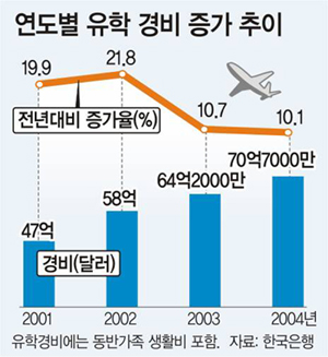 동반가족 생활비를 포함한 유학 및 연수경비도 작년 한 해 70억7000만 달러나 됐다. 해외 연수자 수는 작년 20만1000명으로 2003년(16만4000명)보다 22.6% 늘었고 조기 유학을 떠난 초중고교생만도 10만5000명(2003년)이다.