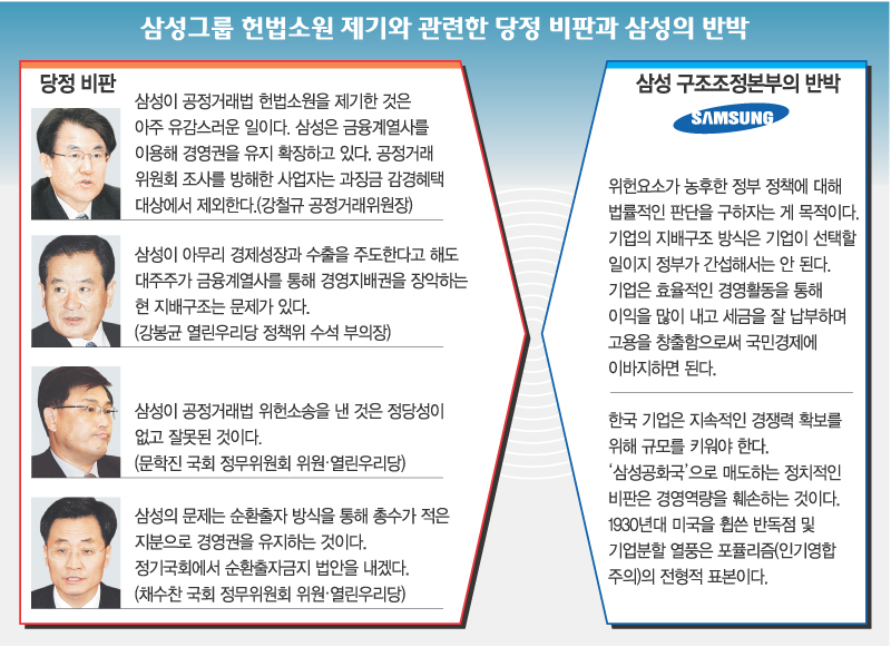 헌법소원 제기 이후 당장 공정위와 열린우리당이 삼성에 대해 비판의 목소리를 높였다. 대부분 삼성의 지배구조에 대한 압박이다. 삼성이 헌법소원을 낸 것을 불편해 하는 속내를 담고 있다.