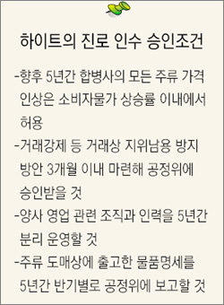 하이트맥주와 진로의 시장점유율은 각각 57%(맥주)와 55%(소주). 맥주와 소주의 최강자가 한솥밥을 먹게 됐으니 국내 주류시장에 거대한 공룡이 탄생한 셈이다.