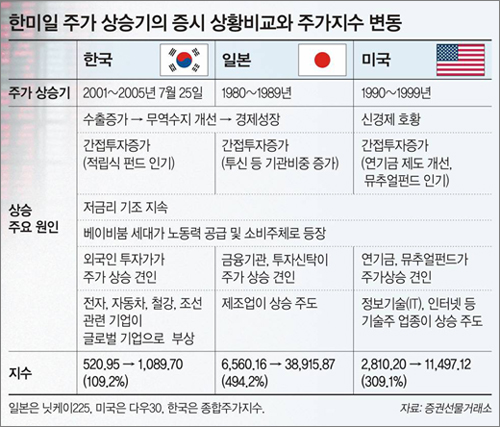 일본은 1980년대, 미국은 1990년대가 주가 상승기였다. 한국은 2001년부터 주가 상승기가 이어지고 있다.