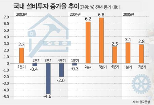 LG경제연구원 오문석(吳文碩) 상무는 “설비투자가 살아나야 소비와 고용지표가 본격적으로 호전될 수 있다”며 “국내 기계 수주액, 자본재 수입액 등 선행지표가 좋지 않은 상태에서 설비투자가 둔화되면 하반기에도 본격적인 경기회복은 쉽지 않다”고 말했다.