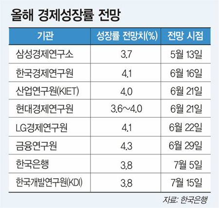 한국은행은 우리 경제가 올 상반기 3.0%, 하반기 4.5% 성장해 연간으로는 3.8% 성장할 것으로 전망했다.