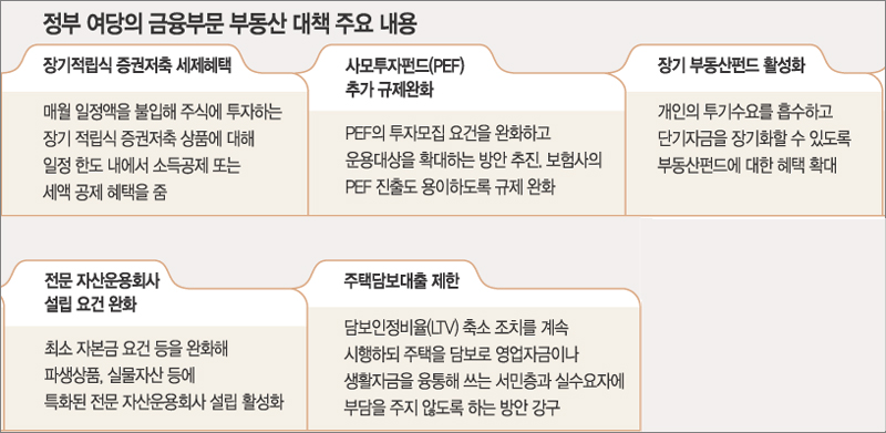 금융부문 부동산 대책은 △세금우대 장기 적립식펀드 도입 △PEF 투자모집 요건 완화 등 규제 완화 △전문 자산운용회사 설립 허용 △장기 부동산펀드와 리츠(부동산투자 전문 뮤추얼펀드) 활성화 등이 포함될 예정이다.