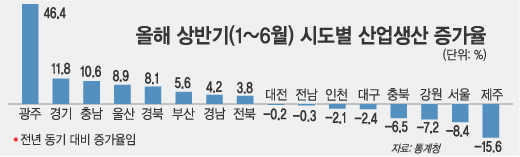 올해 들어 전국 16개 시도 가운데 제주의 산업 생산이 15.6% 줄어 가장 큰 폭으로 감소했다. 이어 서울(―8.4%), 강원(―7.2%), 충북(―6.5%), 대구(―2.4%), 인천(―2.1%), 전남(―0.3%) 등이 감소세를 나타냈다.