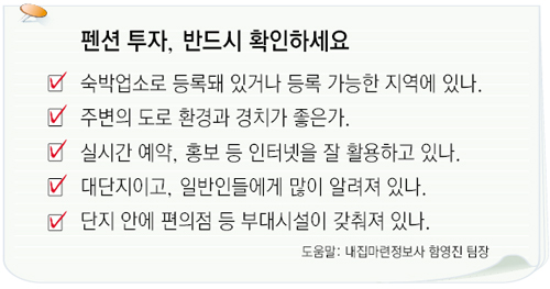 무엇보다 법적으로 문제가 없는지를 잘 따져봐야 한다. 투자하려는 펜션이 숙박업 허가를 받을 수 있는 지역에 있는지, 실제 숙박업소로 등록돼 있는지를 반드시 확인해야 한다.