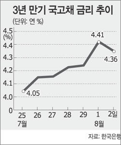 지난달 22일까지만 해도 연 4.03%였던 3년 만기 국고채 금리는 1일 4.41%까지 치솟았다. 2일에는 4.36%로 조금 떨어졌으나 상승 추세가 꺾인 것으로 보기에는 어렵다는 의견이 우세하다.