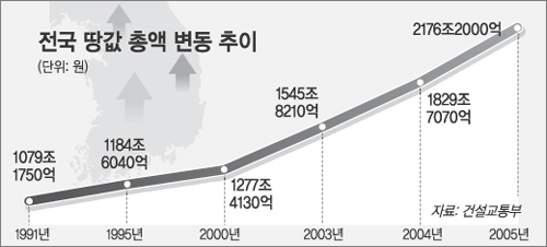 전국 땅값 총액을 계산해 관리하기 시작한 1991년(1079조1750억 원)의 2배 가까이로 늘어난 것이다.