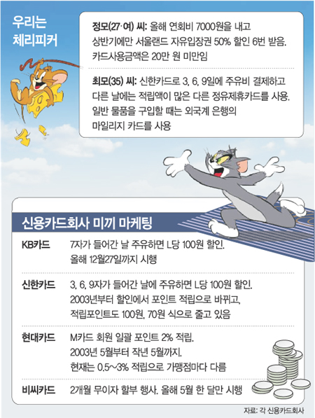 새 고객 유치를 위한 카드회사들의 ‘미끼 마케팅’과 서비스 혜택만 누리고 카드는 사용하지 않는 ‘체리피커’들 사이에 신경전이 계속되고 있다. 카드회사들은 체리피커를 골라내기 위해 까다로운 조건을 내걸지만 체리피커들은 할인 혜택만 누린 뒤 ‘카드 갈아타기’로 맞선다.