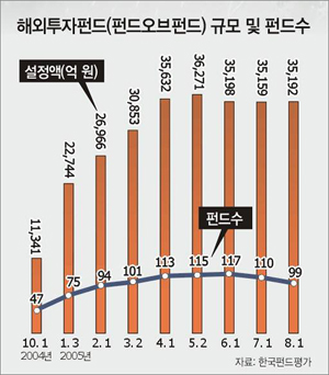 한국펀드평가에 따르면 해외투자펀드는 지난해 10월 1일 현재 펀드 수 47개, 펀드자금규모는 1조1341억 원이었다. 올 4월 1일 현재 113개, 3조5632억 원으로 불어났다.