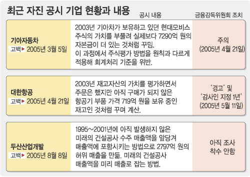 2003년 말 회계장부를 꾸며 719억 원의 자산을 과다 계상(計上)했다고 밝힌 대한항공이나 1990년대 중반 매출액을 2797억 원 과다 계상했다고 고백한 두산산업개발은 표면상으론 ‘고백’ 형식을 띠었다. 하지만 이들 기업은 각각 금융감독원이나 검찰의 회계 감리나 수사를 받고 있던 절박한 상황이었다.