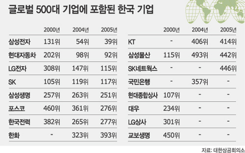대한상공회의소가 9일 미국 경제전문 격주간지 포천의 ‘글로벌 500대 기업(매출액 기준)’ 자료를 분석한 결과 500대 기업에 포함된 한국 기업은 2000년 12개에서 2003년 13개로 늘어났으나 올해는 11개로 줄어들었다.