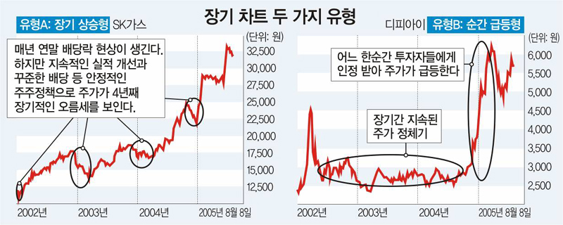반대로 장기 차트 투자는 매매시점을 잡기 위해서가 아니라 오랜 기간 형성된 한 기업의 역사를 보기 위해 사용하는 투자 기법이다.
