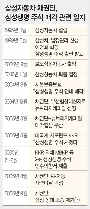 그러나 삼성생명 상장이 번번이 실패하자 삼성차 채권단은 지난해부터 뉴브리지캐피탈 등 국내외 원매자를 대상으로 삼성생명 주식 매각 작업을 벌였다.