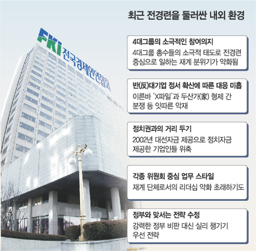 과거 개발경제시대에 정부와 함께 ‘한국경제호(號)’를 이끄는 견인차 역할을 했다는 평을 듣는 전경련은 요즘 제 목소리를 내지 못하고 있다.