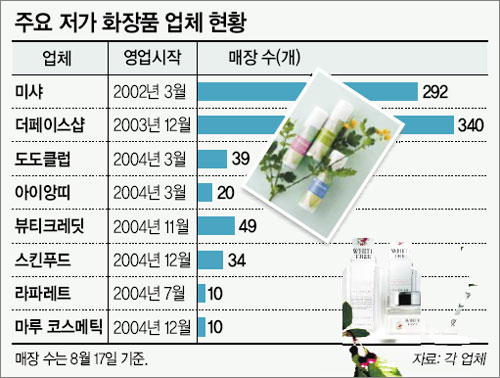 《성장가도를 달리던 저가(低價) 화장품시장이 치열한 경쟁을 벌이는 ‘레드오션’으로 변하고 있다. 저가 화장품시장은 2002년 3월 서울 이화여대 앞에 등장한 에이블씨엔씨의 ‘미샤’ 1호점을 시작으로 3년 만에 시장규모가 2000억 원대로 커졌다. 하지만 미샤가 독주하던 시장에 2003년 말 이후 ‘더페이스샵’, ‘뷰티크레딧’, ‘스킨푸드’ 등 후발주자들이 잇달아 뛰어들면서 경쟁이 심화됐다. 상위 4개 업체의 매장만 700개가 넘는다. 최근엔 태평양, 한불화장품 등 기존 대형 업체들까지 저가시장에 진입했다. 자연히 경쟁에서 살아남기 위해 마케팅 비용은 늘고 영업이익은 줄어드는 추세다. 한화증권 김민정 애널리스트는 “저가 화장품은 고객의 브랜드 충성도가 떨어진다”며 “새로운 브랜드를 내놓거나 기존 브랜드의 파워를 높이는 데 주력해야 할 것”이라고 말했다.》