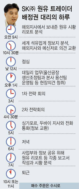 SK㈜ 원유 트레이딩팀에서 계약 주문만을 담당하는 트레이더는 총 10명. 서울 본사에 3명, 싱가포르에 2명, 두바이 런던 휴스턴 베이징(北京) 도쿄(東京)에 1명씩 있다.