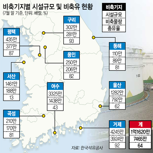19일 한국석유공사에 따르면 7월 말 현재 석유 비축시설 규모는 1억1620만 배럴. 하지만 실제 비축량은 7465만 배럴에 그쳐 시설 대비 비축량(충유율)은 64.2% 수준이다.