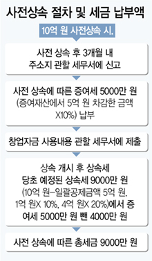 사전상속제는 내년부터 2년간만 한시적으로 도입된다. 30세 이상이거나 결혼한 자녀가 65세 이상 부모에게서 창업자금으로 30억 원 이하의 재산을 받으면 10%의 낮은 세율을 적용한다.
