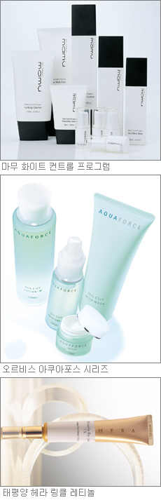 마무화장품은 화이트 컨트롤 프로그램을 추천한다. 피부 노화의 적인 멜라닌 생성을 억제하는 클렌징, 스킨, 로션, 에센스 등이 있다. 클리어 마스크팩은 바르고 15분가량 지난 뒤 씻어내는 팩으로 생기를 주며 청정효과도 있다고. 각질 제거 제품으로는 키엘의 ‘파인애플 파파야 후에셜 스크럽’ 한국화장품의 ‘A3F온 AD 필링젤’ 등이 있다.