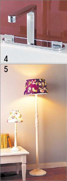 현대적인 욕실 인테리어가 주목받고 있다. 샤워 부스가 설치돼 있어 욕실 바닥에 물기가 별로 없다면 나무 타일로 바닥을 꾸며보자. 세면대 밑에 나무로 된 수납장을 두고 거울 틀도 나무로 만들면 자연 친화적인 욕실 분위기가 난다. 욕실은 샤워헤드나 수도꼭지를 갈아 끼워도 느낌이 달라진다. 동그랗게 곡선을 살리거나 직각으로 된 수도꼭지(사진4)가 요즘 인기다.