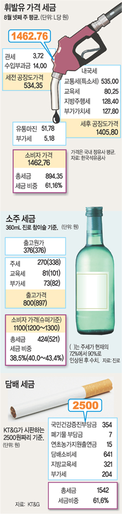 담배 역시 마찬가지. 2500원짜리 담배에 붙는 세금과 부담금은 모두 6가지로 총 1542원. 역시 세금이 61%다. 담배를 피우는 게 아니라 세금을 피우는 셈이다.