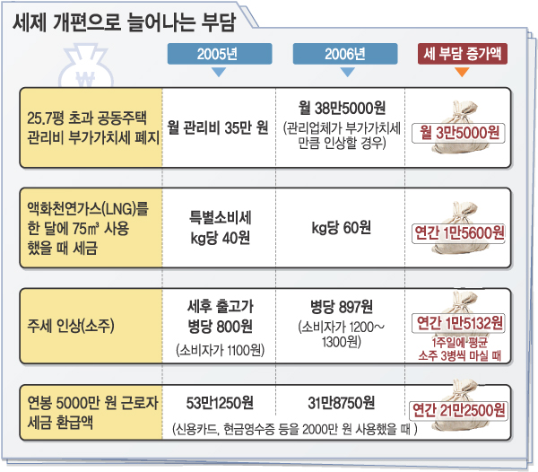 신용카드사용액 소득공제율을 20%에서 15%로 줄이겠다는 것이나 아파트 난방용으로 쓰이는 액화천연가스(LNG) 특별소비세 인상은 서민 살림살이와 직결된다.