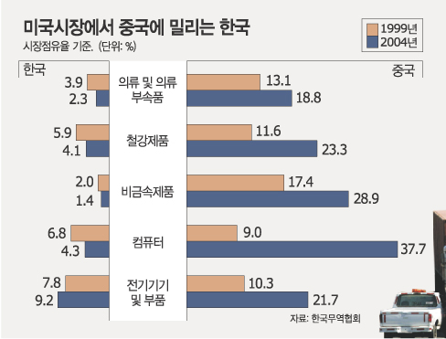 예를 들어 미국 컴퓨터시장에서 한국제품 점유율은 1999년 6.8%에서 지난해 4.3%로 떨어진 반면 중국의 점유율은 같은 기간 9.0%에서 37.7%로 급증했다.