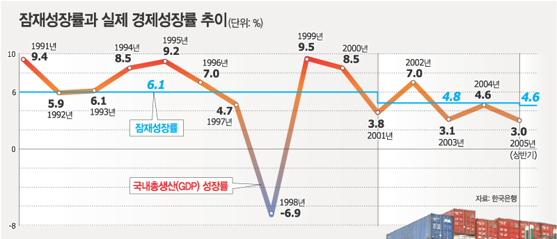 더구나 고령화와 저출산으로 노동력도 줄고 있다. 외환위기 이후 은행들은 안전한 가계대출에 주력하며 기업대출을 꺼리고 있다. 소득 양극화가 심화되면서 증대된 사회적 불안정성도 잠재성장률을 낮춘 원인이다.