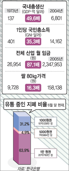 그러나 김 국장은 “1만 원권이 처음 등장한 1973년에 비해 1인당 국민총소득(GNI)은 2004년기준으로 35배가 됐고 소비자물가도 12배 이상 뛰었지만 지폐 액면은 그대로”라며 “고액권 발행은 액면단위 변경보다 시급한 과제”라고 주장했다.