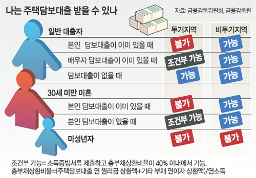 다음 달 5일부터 배우자가 이미 1건 이상 주택담보대출을 받고 있는 사람이 투기지역에서 담보대출을 받으려면 자신의 소득을 증명해야 하고 대출금액도 총부채상환비율(DTI)의 40% 이내로 제한된다.