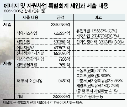 본보가 1995년부터 올해까지 11년 동안 이 특별회계의 세입과 세출을 분석한 결과 총 23조2539억 원을 조성해 7.2%인 1조6837억 원을 국내외 유전 개발 사업에 지원했다.