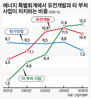 특히 2001년 이후 유전개발 사업비가 전체 지출에서 차지하는 비중은 10% 안팎에 머무른 반면 다른 부처 소관사업은 해마다 급증해 올해는 유전개발 지원보다 2%포인트가량 많다.