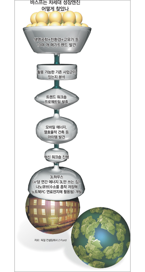 현대 사회에 일어나고 있는 거대한 조류인 ‘메가트렌드’를 짚어 내야 한다. 독일 화학회사 바스프가 ‘친환경’ ‘고유가’라는 메가트렌드를 잡아 연료 소모를 크게 줄인 ‘3리터 하우스’ 시스템을 개발해 최근 각광받은 게 좋은 예다.