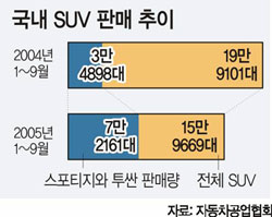 전체 SUV 판매대수에서 소형 SUV가 차지하는 비중은 지난해 22.8%에서 올해 45.2%로 크게 높아졌다. 1∼9월 스포티지와 투싼의 판매량은 7만2161대로 작년 같은 기간에 비해 52% 늘었다.