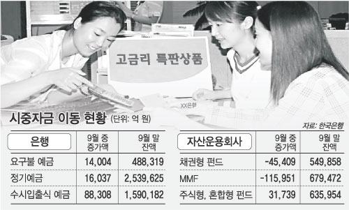 한국은행이 10일 내놓은 ‘9월 금융시장 동향’을 보면 시중자금의 움직임이 확연히 드러난다. 돈이 자산운용회사(투신운용회사 포함)에서 은행으로 옮겨갔다.