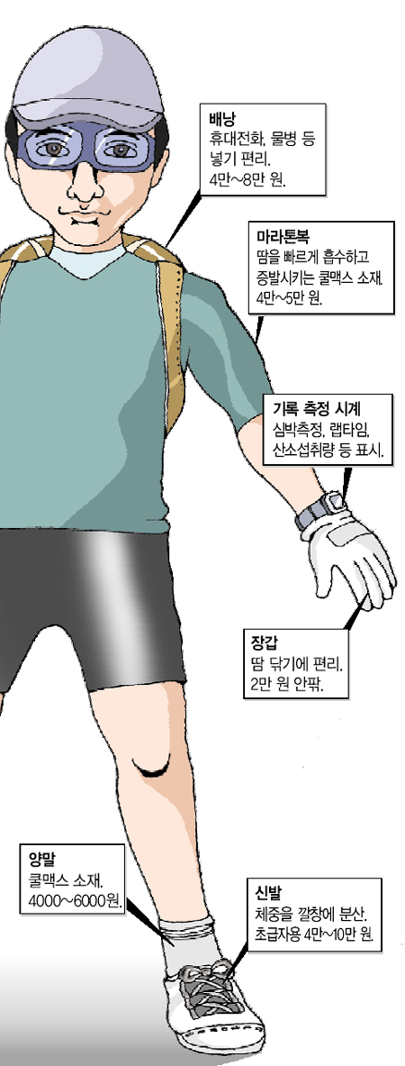 이 밖에 휴대전화 물 등을 넣을 수 있으며 달리기 편하게 디자인한 마라톤 배낭(4만∼8만 원), 흘러내리는 땀을 간편하게 닦을 수 있는 장갑(1만9000원 선)도 갖출 만하다.