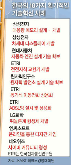 이는 정보기술(IT)뿐만 아니라 자동차 철강 조선 등 전통산업 분야에서도 똑같이 적용된다. 한국이 짧은 시간 안에 반도체 디스플레이 이동통신 등의 분야에서 세계 정상급 수준에 오른 것도 바로 기술력 향상을 중점적으로 추진해온 결과다.