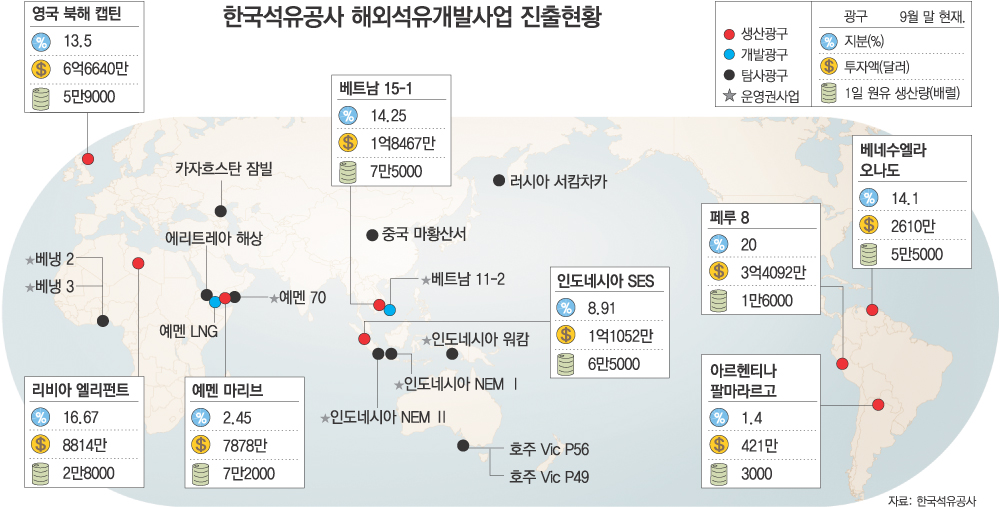 현재 석유공사가 지분을 보유하고 있는 해외 생산유전은 모두 8개. 이 가운데 석유공사 지분이 10%를 넘는 곳은 △베트남 15-1(14.25%) △영국 북해 캡틴(13.5%) △리비아 엘리펀트(16.67%) △페루 8광구(20%) △베네수엘라 오나도(14.1%) 등이다.