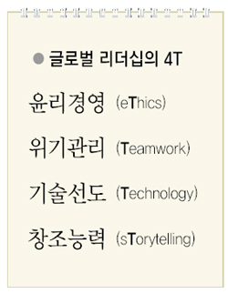 그런 점에서, 글로벌 리더에게는 4T 즉 윤리경영(eThics), 기술선도(Technology), 구성원의 에너지를 극대화하여 창조를 낳고 위기에 대처하는 문화를 만드는 리더십(Teamwork, sTorytelling)이 절실하다.