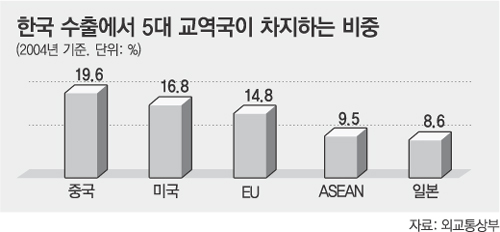 중국은 올해 7월 아세안과 FTA를 발효시켰다. 여기에 한중 FTA가 체결되면 한국 중국 아세안을 묶는 거대 경제권이 형성된다.