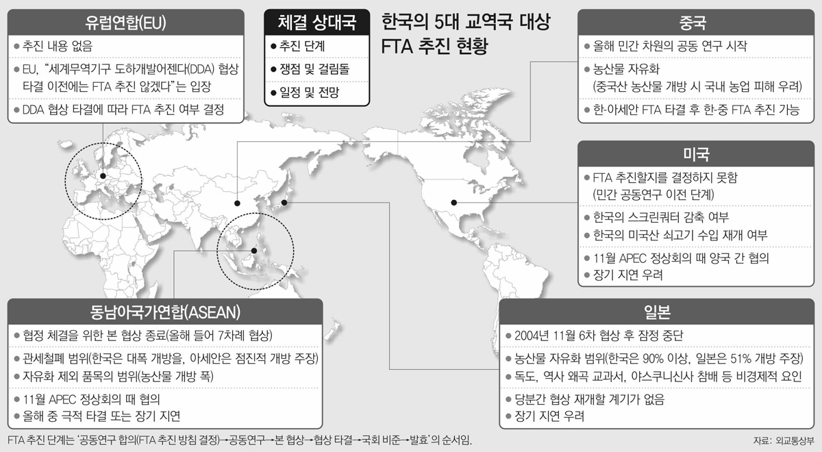 정부가 FTA 전략의 핵심 목표로 삼은 동남아국가연합(ASEAN·아세안) 일본 미국 중국 유럽연합(EU) 등 5대 교역 지역과의 협상이 줄줄이 지연되고 있다.