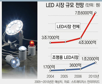 업계에서는 2010년 LED 조명 세계시장 규모가 최소 1조2000억 원에서 최대 4조5000억 원(전체 조명시장은 12조 원)에 이를 것으로 전망한다. 현재 시장이 2500억∼3000억 원에 불과한 점을 감안하면 수요가 폭발적으로 늘어나게 된다.