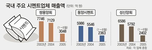 이에 따라 국내 시멘트업체들의 실적은 계속 곤두박질치고 있다. 시멘트업계의 ‘빅3’인 쌍용양회 동양시멘트 성신양회는 지난해에 이어 올 상반기에도 10% 이상씩 매출이 줄었다.