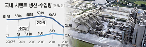 값싼 중국 시멘트는 최근 밀물처럼 들어오고 있다. 2000년 51만 t이었던 시멘트 수입은 지난해 339만 t으로 불과 4년 사이에 약 6배로 증가했다. 수입의 대부분은 중국산이다.