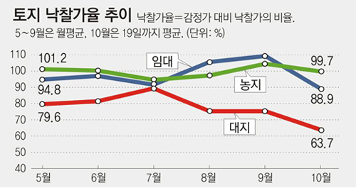 덩달아 낙찰률(집행건수 대비 낙찰건수 비율)도 9월 51.4%에서 이달에는 29.5%로 낮아졌다.