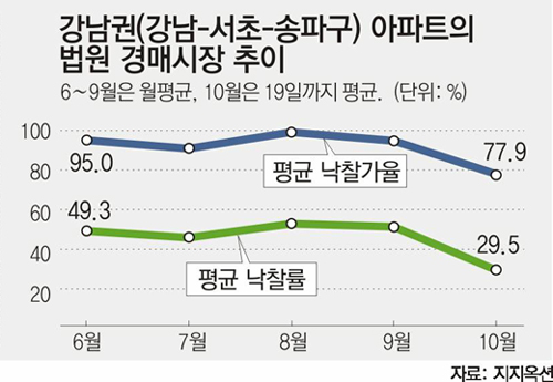23일 법원경매정보회사 지지옥션에 따르면 서울 강남 송파 서초구 등 ‘강남 3인방’의 월평균 낙찰가율(감정가 대비 낙찰가 비율)은 4∼9월 90%대를 유지했다.