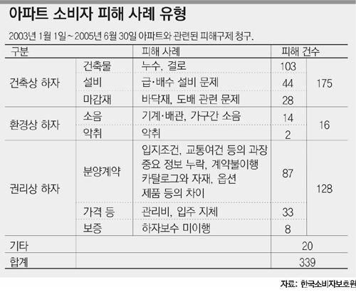 한국소비자보호원에 따르면 2003년부터 올해 6월까지 접수된 아파트 소비자 피해 구제신청 339건 가운데 카탈로그나 모델하우스에 소개된 것과 실제 시공 내용이 다르거나 계약대로 지어지지 않았다는 신고는 128건(38%)이었다.