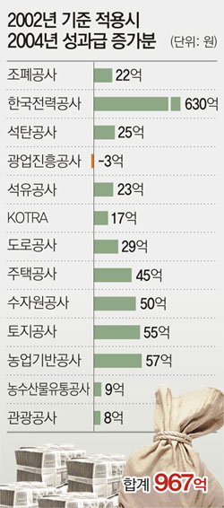 이에 따라 지난해 이들 기관의 임직원은 2002년 기준을 적용했을 때와 비교해 총 967억여 원의 성과급을 더 받았다.