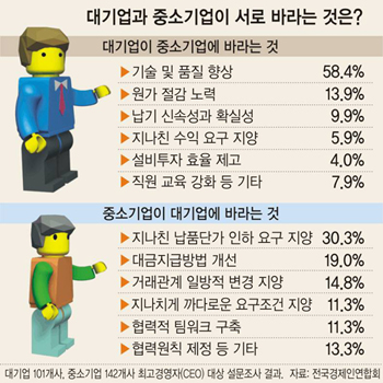 대기업들이 중소기업에 느끼는 불만으로는 △제조기술이 뒤지고(58.4%) △원가절감 노력이 부족하며(13.9%) △납기가 불확실하다(9.9%)는 점을 꼽고 있다.